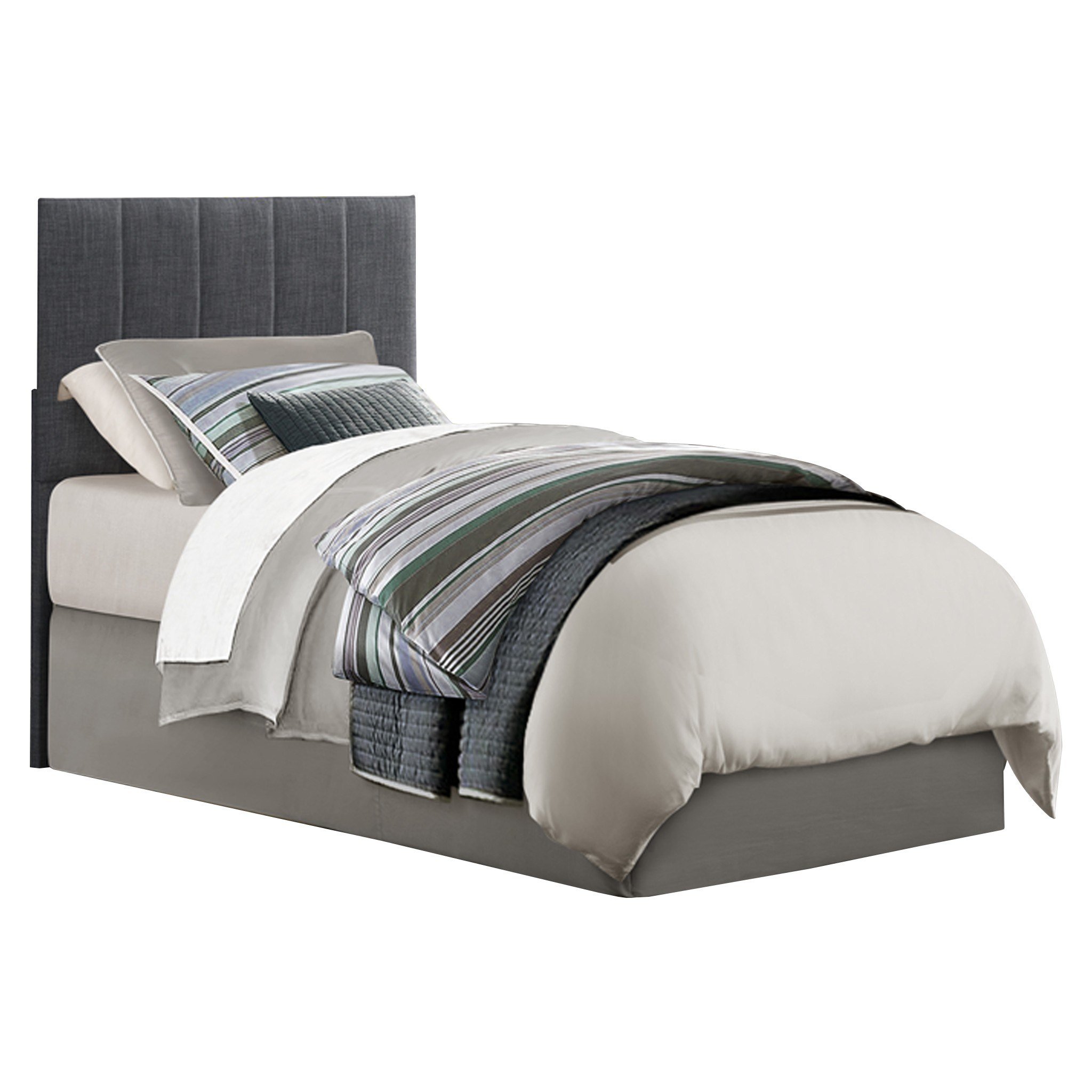 Gray fabric covers the padded vertical channel tufted twin headboard in the Potrero Collection. The streamlined profile was designed for maximum versatility of placement within your home's decorative environment.PRODUCT DIMENSIONS: Overall Dimension: 40.75" x 2.25" x 48.25"HBottom of headboard to floor: 24"Width between pre-drilled holes: 37.5"Height of pre-drilled holes to floor: 4.75"Listing Includes: One Headboard Only.Footboard, rails, slats, mattress: Not included.Simple Assembly Require.