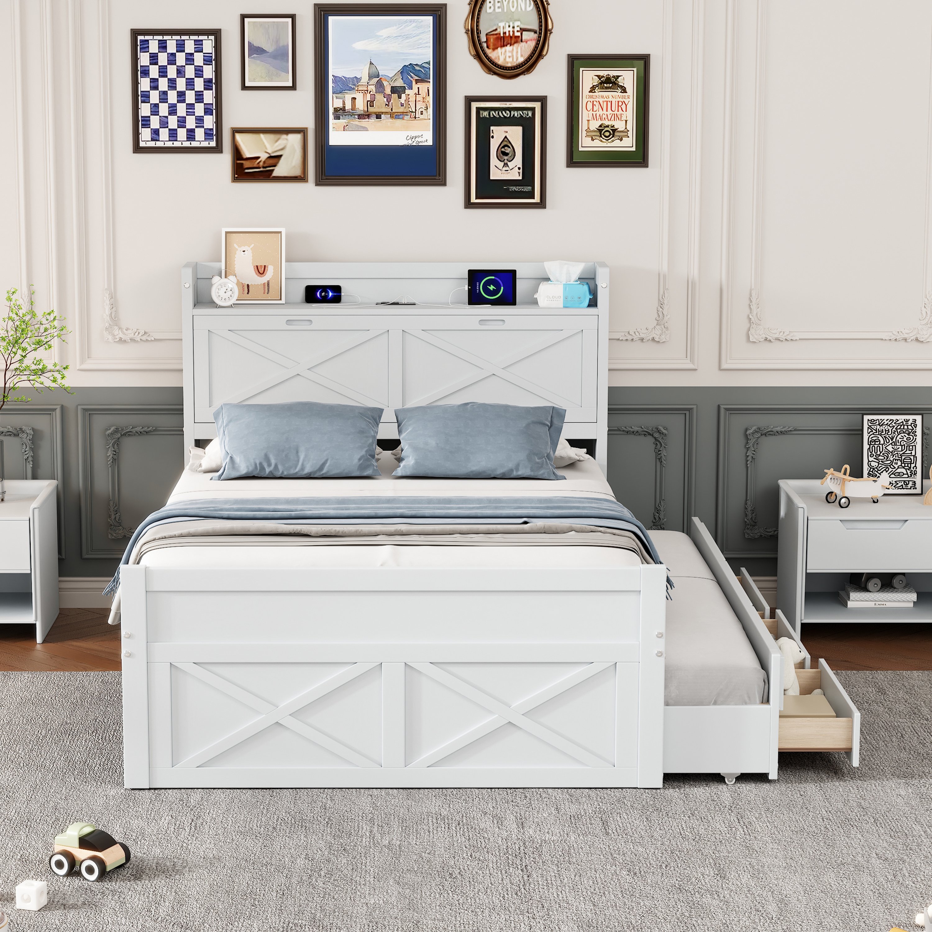 Full Size Wooden Bed with Storage Headboard with Outlets, Extendable Bed with Twin Size TrundleThis bed's headboard can be opened to store your personal belongings and features with built-in outlets, available in white or grey . It comes with three drawers for convenient storage and one pull-out bed for extra sleeping space. This design is not only practical but also stylish, making it an ideal choice for any modern bedroom. The solid MDF and plywood frame ensures durability and stability, while the sleek and minimalist design adds a touch of elegance to any room.