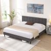 Selling Points: ★ Sturdy and Durable Structure: The upholstered platform bed wood frame is made of sturdy wood construction; solid wood slats and 8 pcs center support legs. It can provide strong support for up to 800lbs. ★ Modern Style: With its distinct square tufted headboard; this bed frame has a simple but elegant look that blends well into any home; bringing a warm feeling to your bedrooms or guest rooms. ★ Noise Free Design: The non-slip strips with silicone buckles of queen bed pressed the slats can prevent noise. Plastic feet pads protects your floor from scratches.★ No Box Spring Needed: This platform-style bed includes a series of durable; evenly-spaced slats designed to support your existing mattress directly; no box spring is required. Save your money and time.★ Easy to Assemble: Each part of the bed frame is numbered and has a clear manual; no need to worry about installation. Please follow the assembly instructions to select the corresponding parts for assembly.Specifications:---Product Type: King Size Bed Frame---Colour: Fabric/Grey---Overall Size: 80"L x 76"W x 40"H---Material: Metal+MDF+Foam+Fabric---Assemble Require: Yes---Weight Capacity: 800 Pounds.---Number of Slats: 10 pcs---Number of Package: 1---Recommended Mattress Thickness: 10-14 Inch---Spring box: No need---Package Content: 1xBedframe+1xInstruction---Country of Origin: China