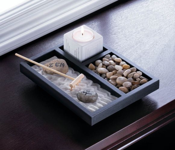 • Enjoy your own private Zen garden, even if you're short on space! Nifty tabletop box contains every essential- sand, rocks, candleholder and rake- to create a serenely scenic escape from the everyday.