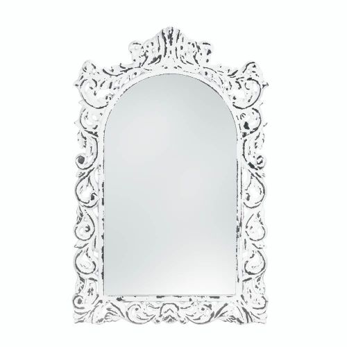 This amazing wall mirror is the culmination of classic style and timeworn beauty. The elaborately carved frame features a vintage design with fantastic flourishes that are given plenty of drama thanks to the weathered finish of the white paint. The arched mirror will feel at home in your entry, above your mantel or in your powder room. Weight 4.2 pounds. 15" x 0.5" x 23". MDF Wood, Mirror. UPC Number: 849179032319.