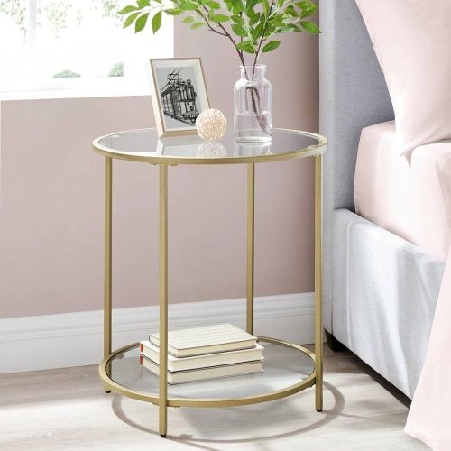 Modern Glass Top Round Metal End Table Nightstand with Bottom Shelf in Gold