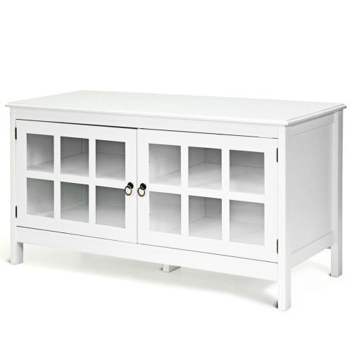 White Wood Entertainment Center TV Stand with Glass Panel Doors