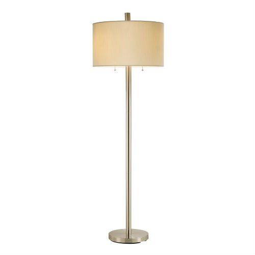 With an appealing sense of elegance and grandeur, this Contemporary Satin Steel Floor with Oversized White Silk-like Drum Shade shines decoratively, imbuing a delightful aura into any room it furnishes. Each Boulevard lamp has a chunky satin steel pole and flat round base, with a white silk-like fabric drum shade and matching finial. Double sockets each have a ball-accented pull chain switch. 2 x 100 Watt. 61" Height, 11" Base. Shade: 11.5" Height, 18.5" Diameter.